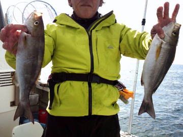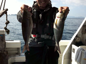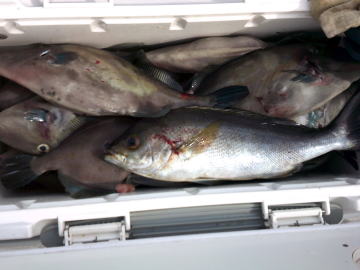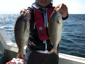 | 3月2日(日) 急遽大分の僚船とアマダイ&イトヨリダイに 初めて挑戦しました。アマダイは釣れませんでしたが イトヨリダイは釣れました。外にマダイ・カサゴが 釣れました。この釣りは根掛かりしないから誰でも 楽しめます。但しアマダイは穴から餌を追いますから 釣り方に一工夫がいるようです。勉強します。 |