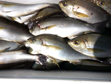 | 7月26日(土) 今日も良く釣れました。 追い食いの妙を楽しんで下さい。 1匹釣れてそのまま次を待っていたら 根に入ってしまいますから、1ヒロ上げて重く なるのを待って上げて下さい。数釣りと根掛かり の妙が楽しめますヨ。 |
