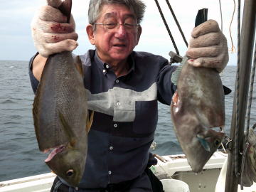 | 10月18日(土) 潮が緩いせいかハゲが邪魔したので ハゲ狙いに変更。初めは針に掛かって いましたがその後賢くなりました。 その日の潮をみてイサキ重視かハゲ重視か 見極める要があります。 |