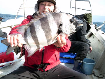 | 12月29日(月) イシダイが釣れました。 今後が楽しみです。外にハタ、イサキ、 タイ、ハゲが釣れました。65センチでした。 |