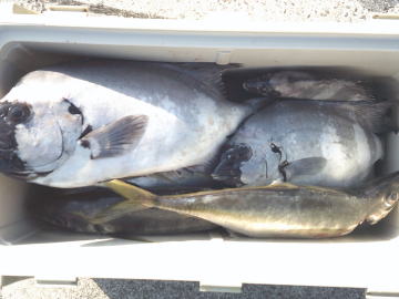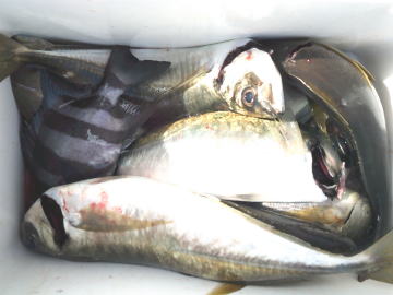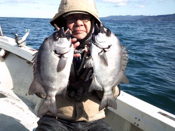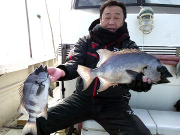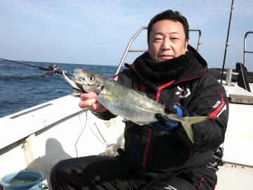 | 1月26日(月) シケ続きでしたが、ようやく出ることが できました。イシダイ、アジ、イサキ、ハゲ等が 釣れました。エサ取りのハゲの出没に備えて サビキ仕掛けも要るかも? |