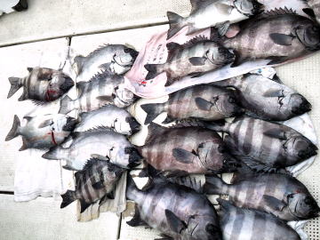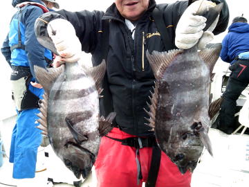 | 2月14日(土) 一足飛びに春が来たようでした。 今日はイシダイが釣れました。4人のイシダイ釣果 です。2人は提出をしてもらえませんでした。残念。 |